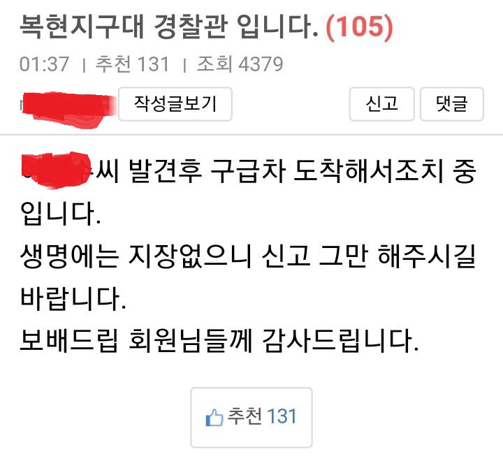 보배형님들의 신고와 아는동생의 관심으로 무사히 발견하여 병원이송......